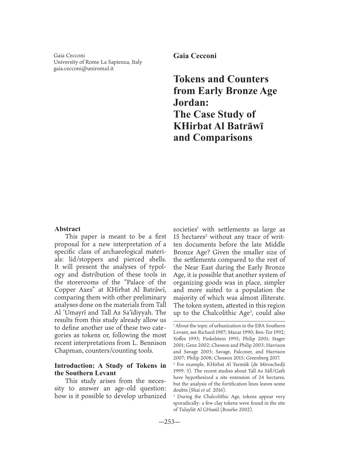 Tokens and Counters from Early Bronze Age Jordan: The Case Study of KHirbat Al Batrawi and Comparisons