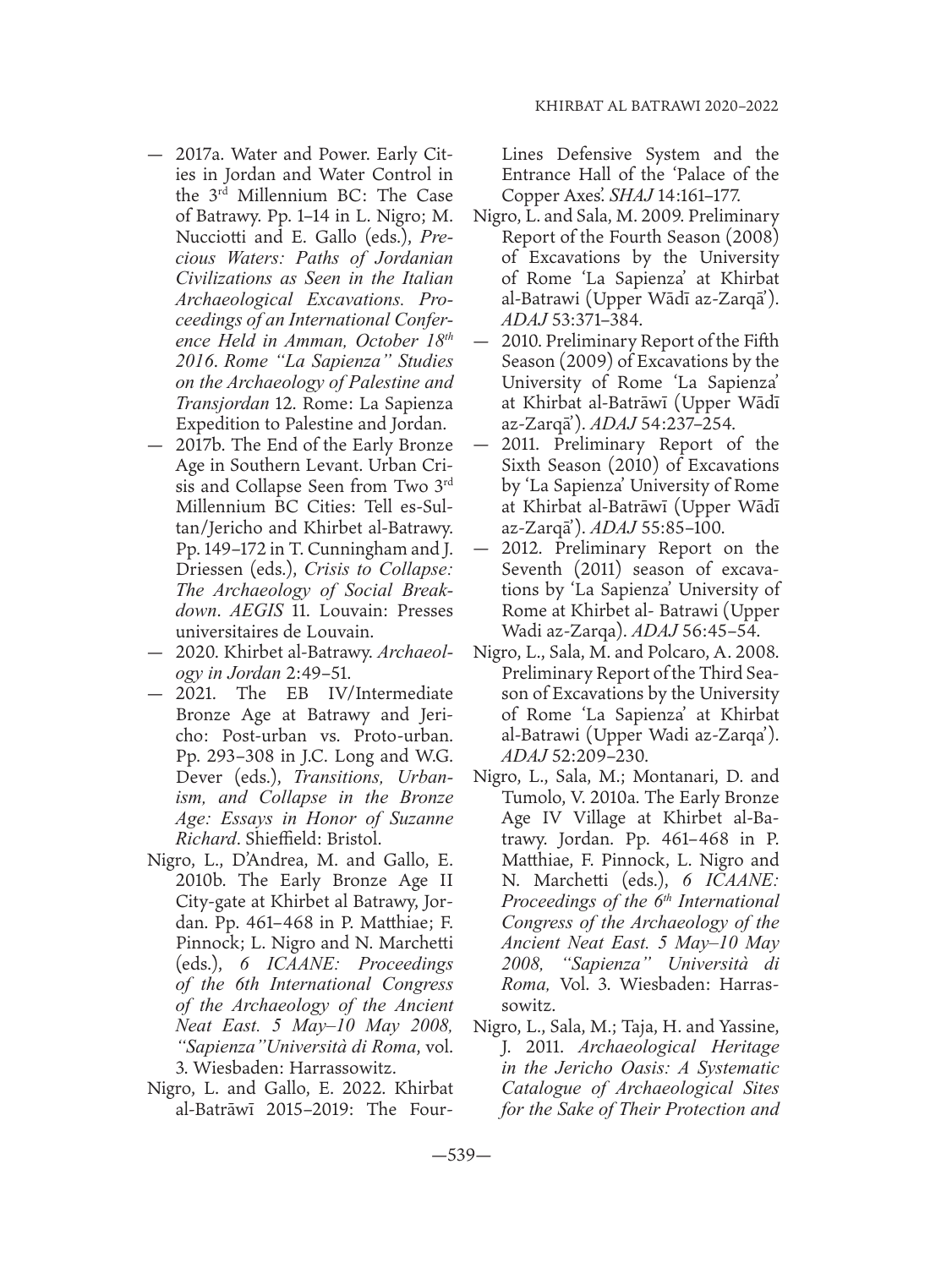 From Documentation to Reconstruction of Late Bronze Age Temples in Jordan: The Case of the ‘Amman Airport and Al Mabrak Education Is the First Step of Protection before Archaeological Excavation: KHuraybat As Suq Site as a Challenge Example Documentation, Re-assessment and Re-interpretation for KHirbat Az Zayraqun’s Religious Complex, and a Suggested 3-D Reconstruction during the Early Bronze Age I, II and III Ayn GHazal Two-Headed Bust at Louvre Abu Dhabi: Exploring Stories of Cultural Connections The New Dushara Sanctuary at Al Mahafir in Petra Rapid Tectonic Evolution of the Levant during the Pleistocene and Its Implications for Topography and Local Lake Formation and Disappearance: Factors Affecting Human Migration and Settlement Jordan Cultural Landscapes: Making Significant Experience at the Folklore and Popular Traditions Museums (ʻAmman) Digital Library of Living Traditions: A Proposal for the Intangible Cultural Heritage in Jordan Preliminary Report on the Excavation of a Roman Bronze-Casting Workshop on the Lower Terrace of the Temple of Zeus ( Jarash/Gerasa) Celebrating 66 Years of Acheulean Exploration and Discovery in the Central Al Azraq Basin, Jordan A Large Courtyard Building from the Byzantine and Umayyad Periods in Front of the Nymphaeum in Jarash ( Jordan): First Results of the Eastern Jarash Project A First Insight into the Intra Muros Settlement Dynamics of the Gadara Hilltop, from the Hellenistic Period to Modern Times Insights into Investigation and Building Conservation in the Old Village of Al Harah Al Fawqa in Umm Qays, Jordan: Reconstructing the Historic Roof of the Al Madafah in Bayt Ar Rusan The Food Production Activities in the EB I Site of Jabal Al Mutawwaq: Evidence from the Settlement and the Necropolis Tokens and Counters from Early Bronze Age Jordan: The Case Study of KHirbat Al Batrawi and Comparisons The Madaba Regional Archaeological Museum Project (MRAMP) Workshop Physical in situ and Digital/Virtual Reconstructions and the International Heritage Charters and Conventions: A Critical Overview The Goddess of Victory at Al Humaymah and in Nabataean Art Nabataean, Ancient North Arabian, Greek and Latin Inscriptions from Bayir (Southeast Jordan): A Reassessment Was Sahab the First Ammonite Capital? Where DHiban Meets ‘Ataruz: Bayadah, Ancient Roads and the Mesha Inscription The ‘Abbasid Family Estate at Al Humaymah: New Insights from Analysis of the Ceramics from Field F103 The Origins of the Ammonites Turning Downtown ‘Amman into a Tourist Destination through the Exposure of the Roman Baths at Al Hashimi Street Cultural Heritage and the Fight Against Illicit Trafficking in Jordan: The Project to Prevent Illicit Trafficking The Excavation in Umm Qays, Jordan, 2005–2017 KHirbat As Sar (Sarah), a Site between the Ammonite and Mamluk History of Jordan Conservation and Community Participation at the Palace of Prince An Naq Al Jamdar in Historic Cairo for Use at Similar Sites KHirbat Al Batrawi 2020–2022: The Palace of the Copper Axes and the North-Eastern City Fortifications The Shobak Project: A Programme to Support the Socio-Economic Recovery in the Protected Area of Ash SHawbak Castle Zuwarah (Zughar) in the GHawr As Safi, Jordan: Interdisciplinary Research and Study of the Discoveries of an Early Byzantine and Medieval Islamic Commercial City in Palaestina Tertia - Southern Bilād Ash SHām Redefining Societal Transformation in the Early Bronze Age of Jordan: Recent Discoveries and Chronological Modeling at KHirbat Iskandar Curative Water in Jordan: Therapeutic Agents, Tourism and Archaeology Capacity Building for Sustainable Preservation The Lordship of Transjordan: Settlement Patterns, Economy and Society in the Crusader Period Sustaining Good Practice in Jordanian Museum Education “Sea Peoples” on Tall Zar‘a in Northern Jordan?: Material Culture, Cult and Political Power Far Away from the Mediterranean Cities The Technical School of the Central Nabataean Temples Historical Islamic Architecture in Northwestern Jordan: Heritage Mosques in Irbid Governorate The Christian Community of Rihab during the First Phase of Islamic Domination through Epigraphic Sources Herodian Stone and Stucco Artworks in the Royal Palace of Mukawir (Machaerus)Thumbnails