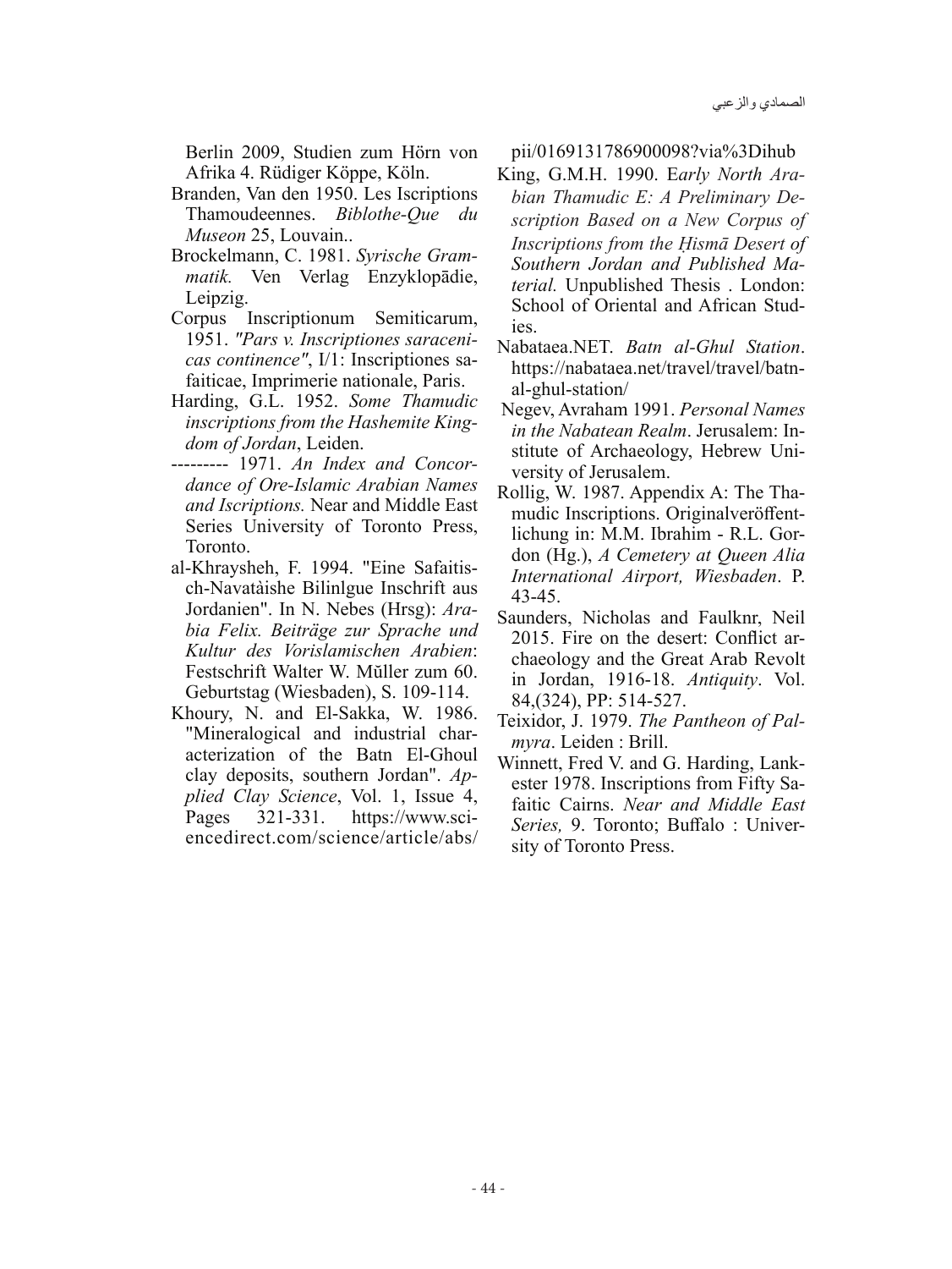 من القصب إلى السكر عرض وتحليل لآلية معاصر السكر في منطقة وادي الأردن (دراسة مقارنة) تحليل معماري لمسرح بيت راس وارتباطه بأسوار المدينة دراسة تحليلية لنقوش ثمودية من وادي بطن الغول - الأردن الشاعر النبطي الكركي عبدالله سالم العكشة (1880-1956) حماية المواقع الأثرية من خلال تغطيتها (إعادة طمرها)، تغطية بقايا الحمام الروماني في وسط البلد مصادر المياه عند قدماء بدو شمال الجزيرة العربيّة (البادية الأردنيّة) التلوث الصناعي بالنحاس في فينان جنوبيَّ الأردن الأعمال المساحية والرسم الخاص بالمواقع الأثريةThumbnails